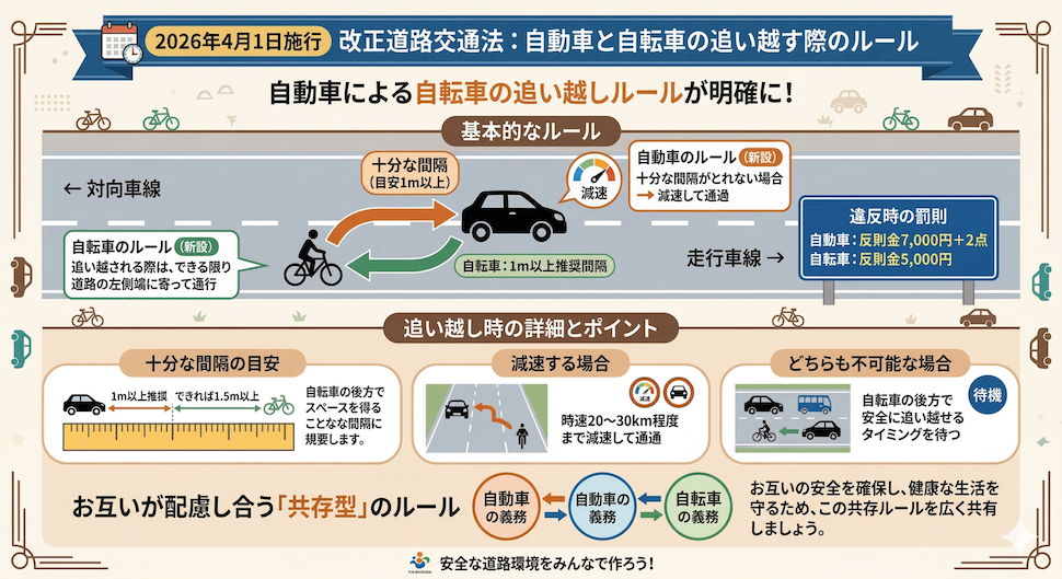 図:自動車が自転車の横を通過する際の新ルール(2026年4月1日〜)